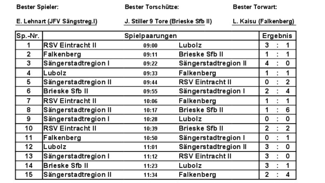 Neben den Pokalen für alle Mannschaften wurden auch der Beste Spieler des Turniers ausgezeichnet. Hier konnte mit E. Lenhart ein Spieler des JFV Sängerstadtregion geehrt werden. Bester Torschütze wurde mit 9 Treffern J. Stiller von Brieske Senftenberg und Bester Torwart L. Kaisu von Lok Falkenberg.